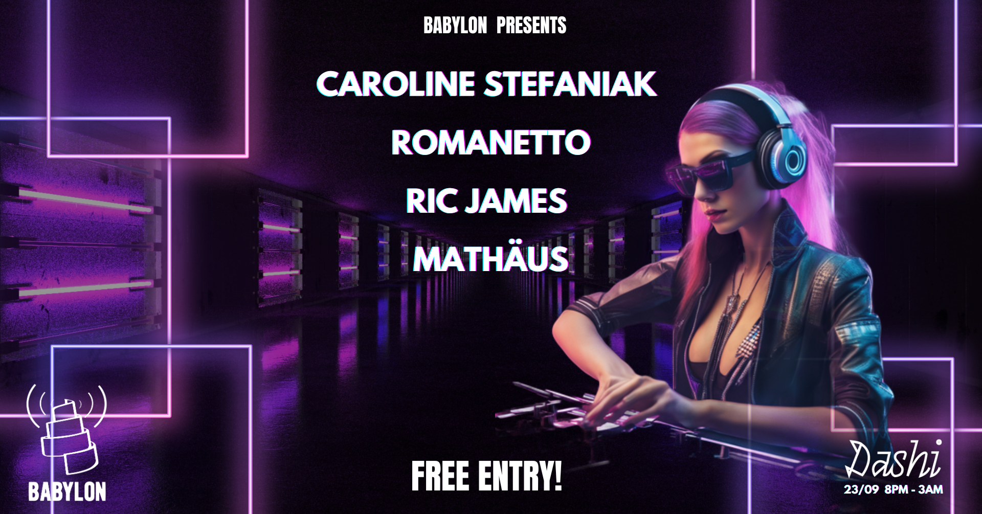 Babylon presents another free techno night! Join us Saturday night at Dashi to see Romanetto, Ric James, Mathaus, and Caroline Stefaniaks!